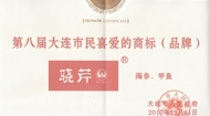 通過市工商局和國家統(tǒng)計(jì)局大連調(diào)查隊(duì)合作,以及《大連日?qǐng)?bào)》、《大連晚報(bào)》、《新商報(bào)》等媒體合作,經(jīng)過一個(gè)月的調(diào)查統(tǒng)計(jì)工作,最終大連“曉芹”商標(biāo)(品牌)獲得大連市政府頒發(fā)的“市民喜愛的商標(biāo)”稱號(hào)證書、牌匾。